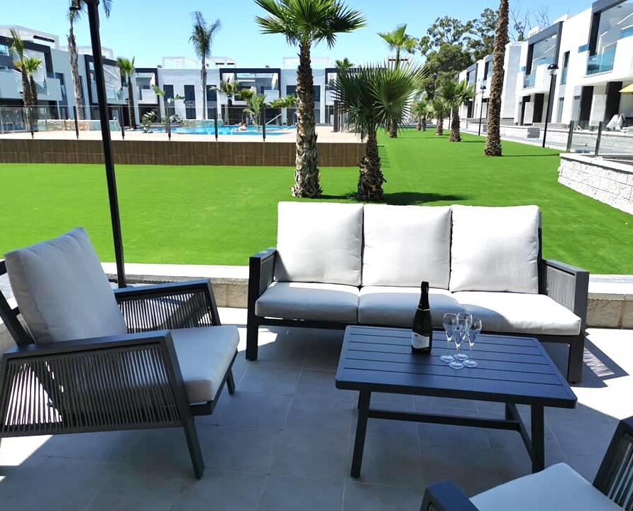 Elegant 3-bedroom ground-floor apartment with private terrace, just 3 km from the beach. Set in a secure residence with pool, gardens, wellness area, and close to golf and coastal towns—perfect for a relaxing stay in the sun.